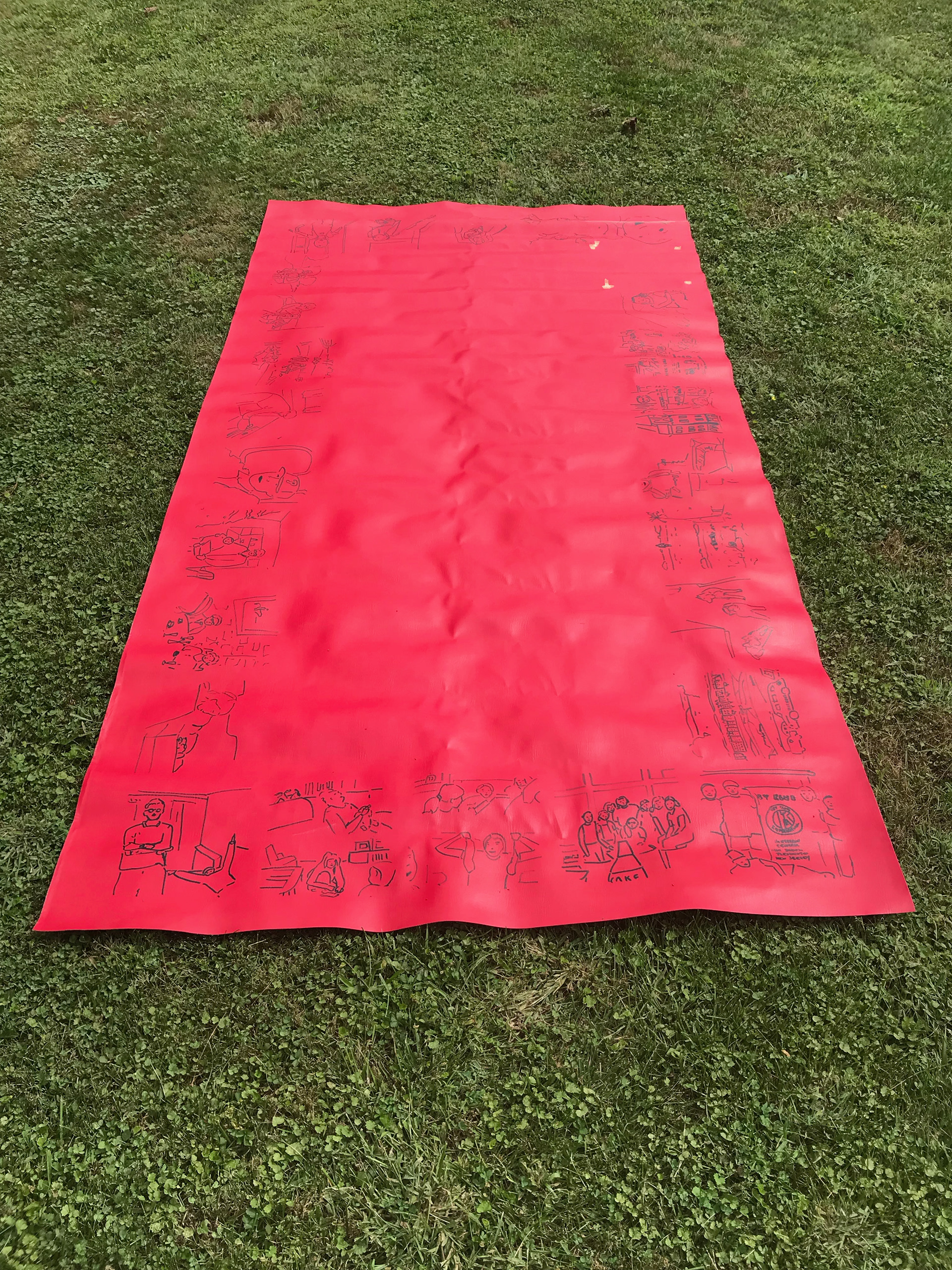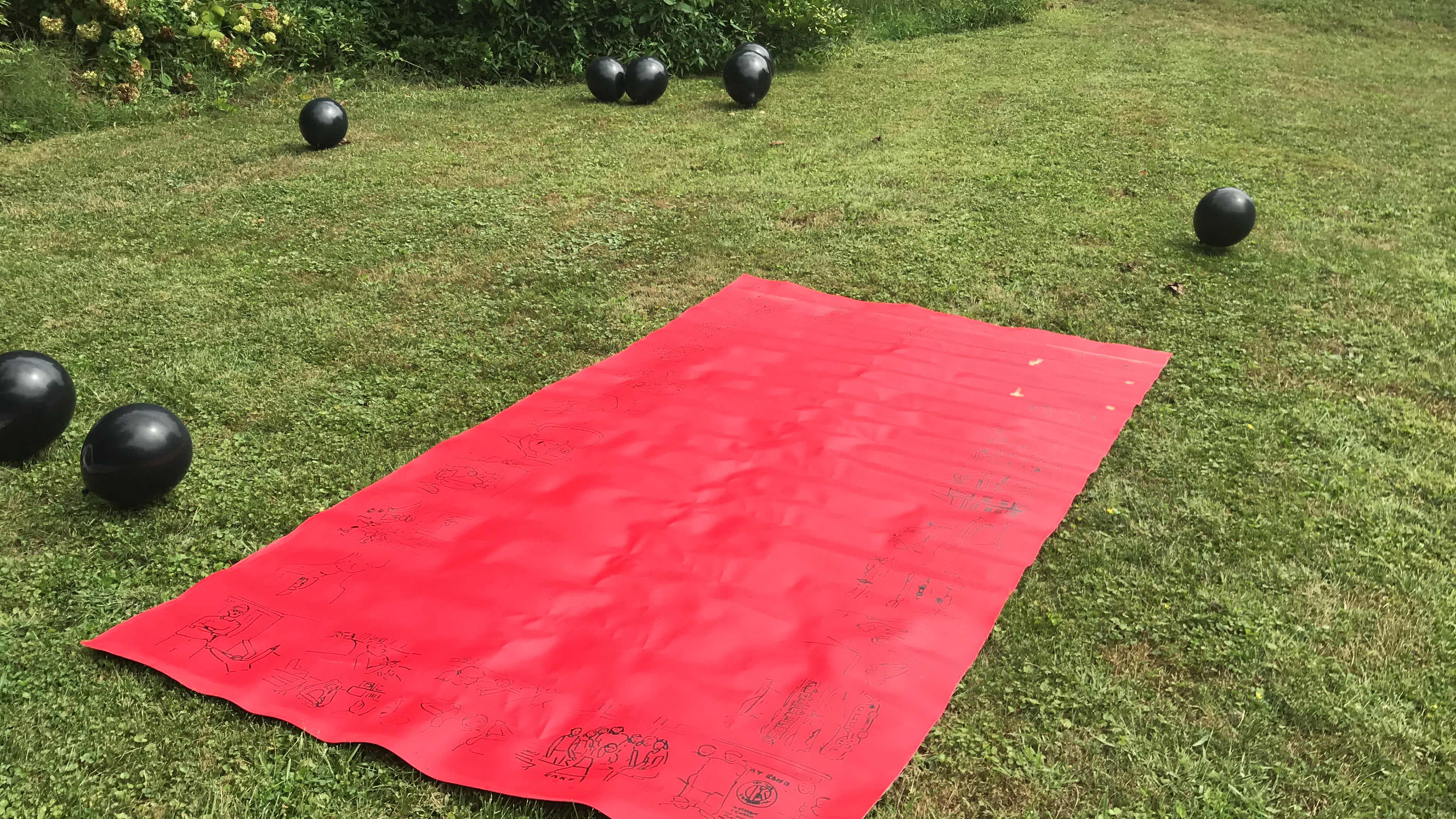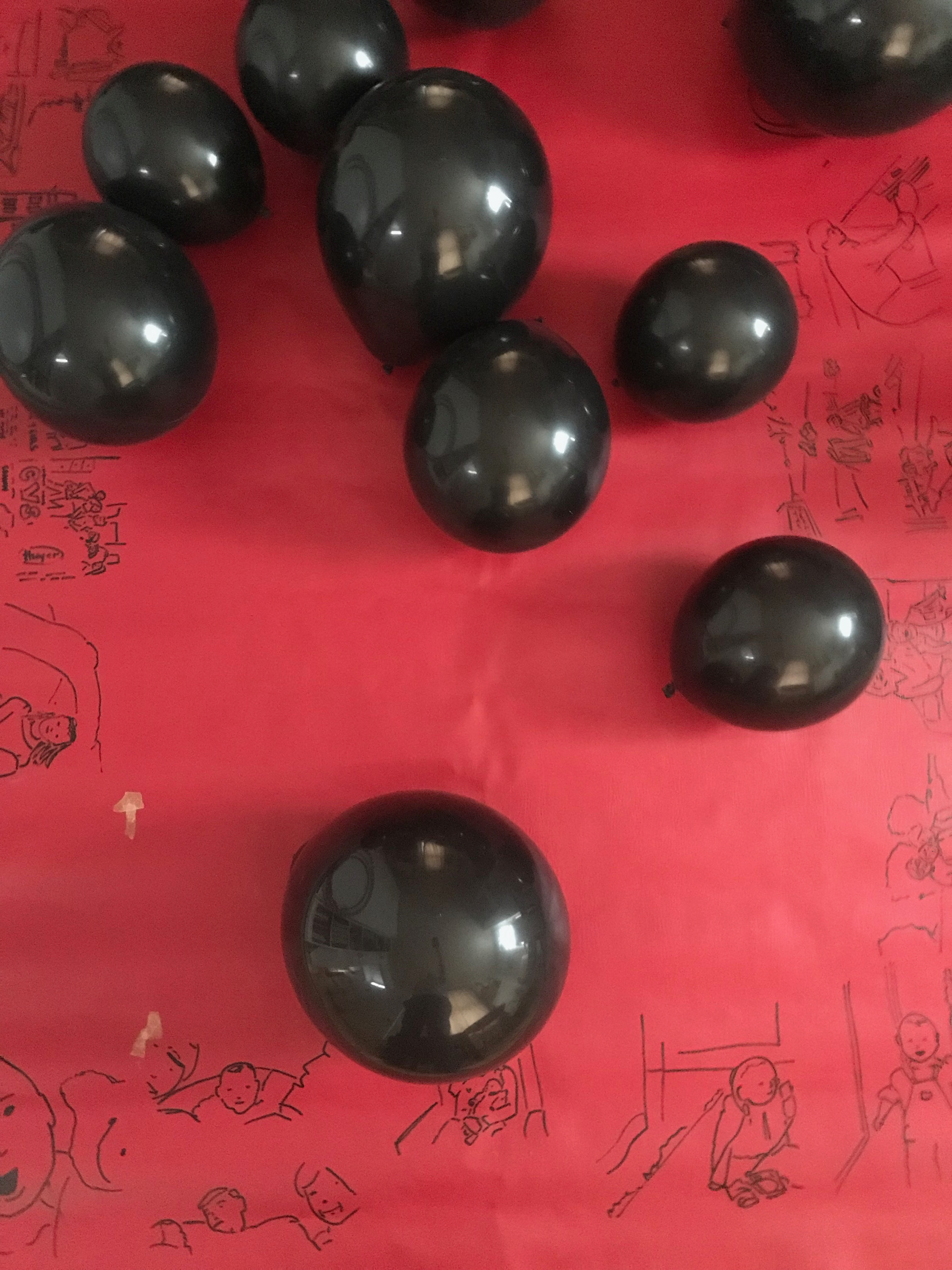 vinyl fabric, permeant marker, tape, black latex balloons