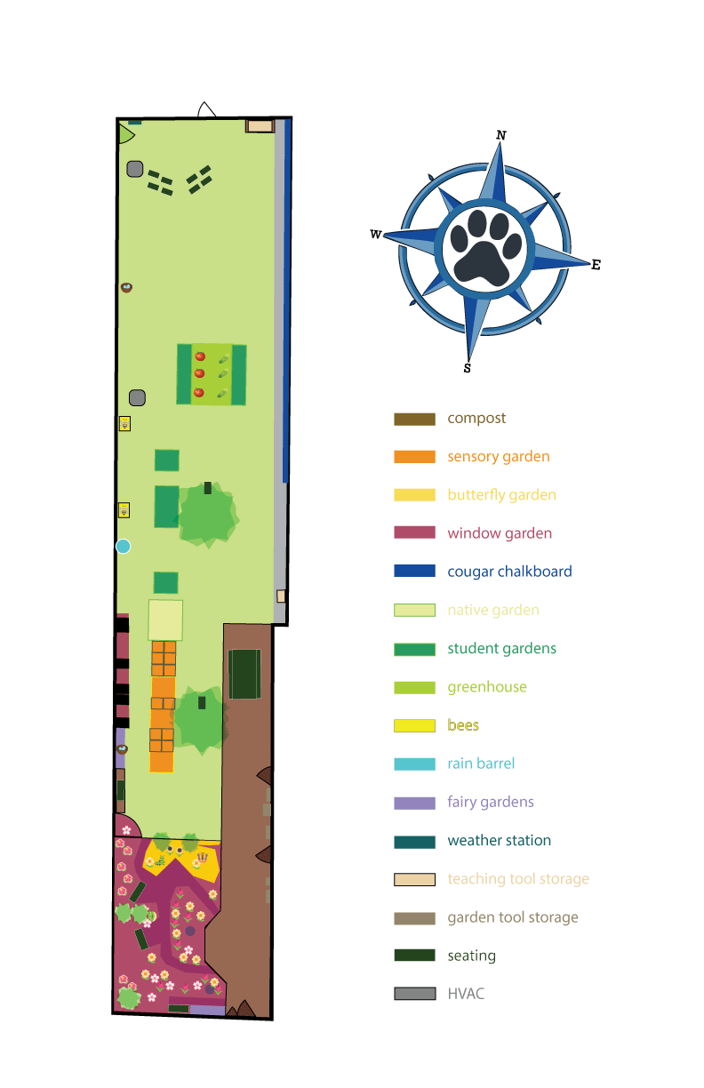 An Interactive Educational Garden in courtyard at public elementary school featuring a Butterfly Butterfly Garden to host and attract butterflies and Cougar Chalkboard mural.